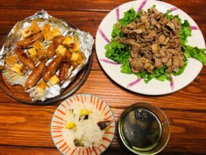 おかずはたったの3品ですが、ごはんがサツマイモごはんなので薄味がついています。