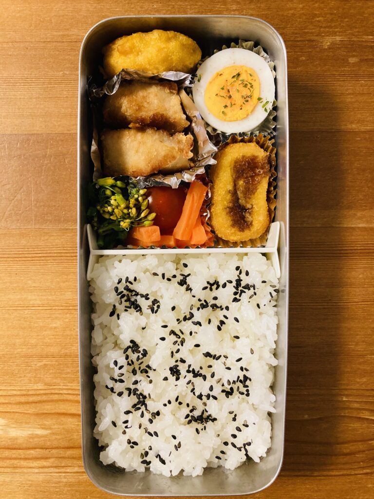 おかずは茹で卵、クリームコロッケ、チキンナゲット、唐揚げ、ミニトマト、人参、菜の花です。