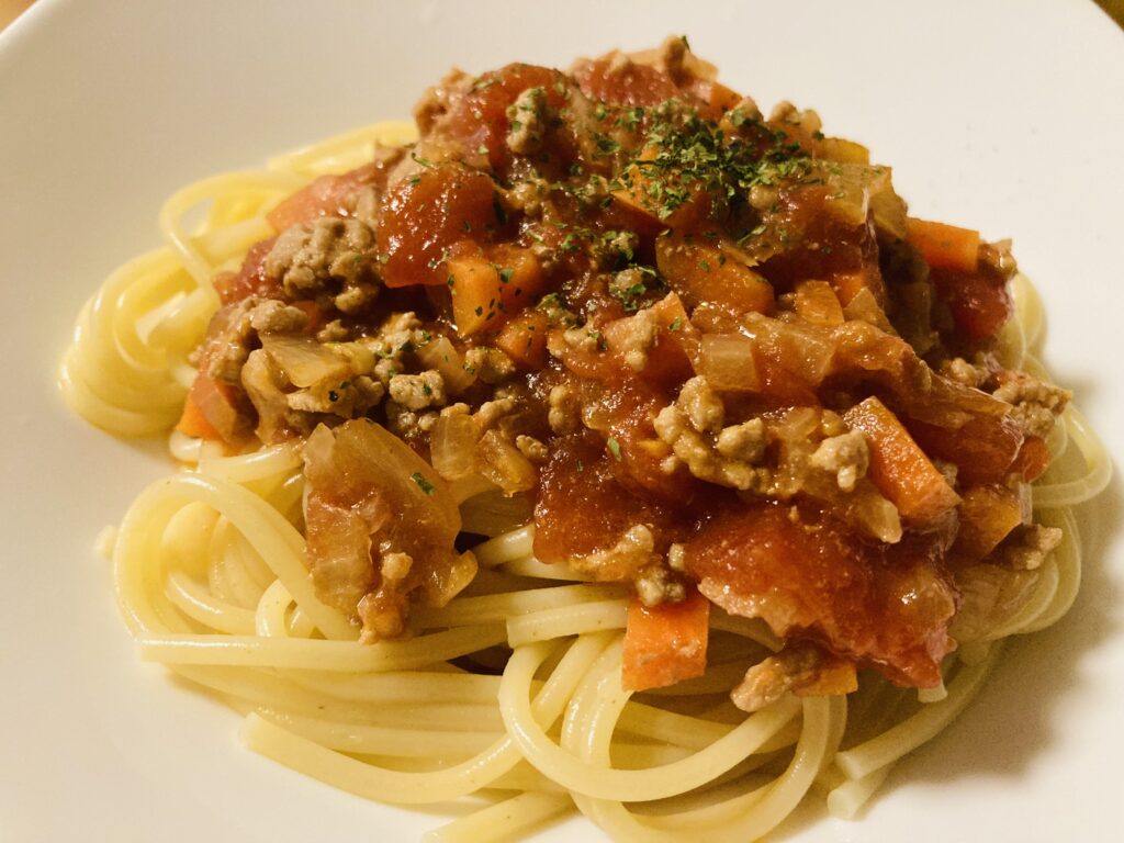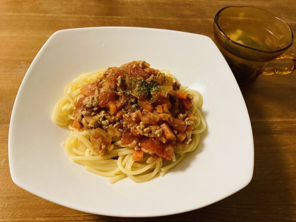 晩ごはんはミートソースパスタと、菜の花とタケノコのコンソメスープです。