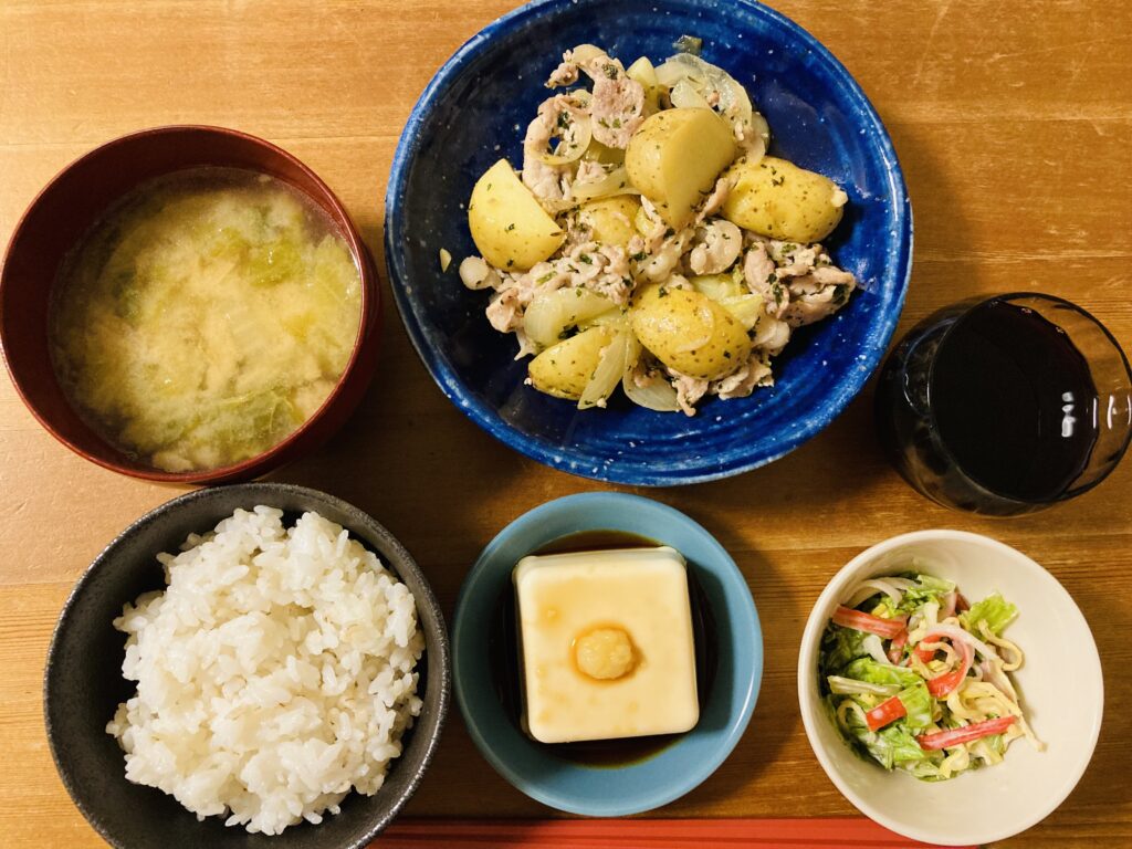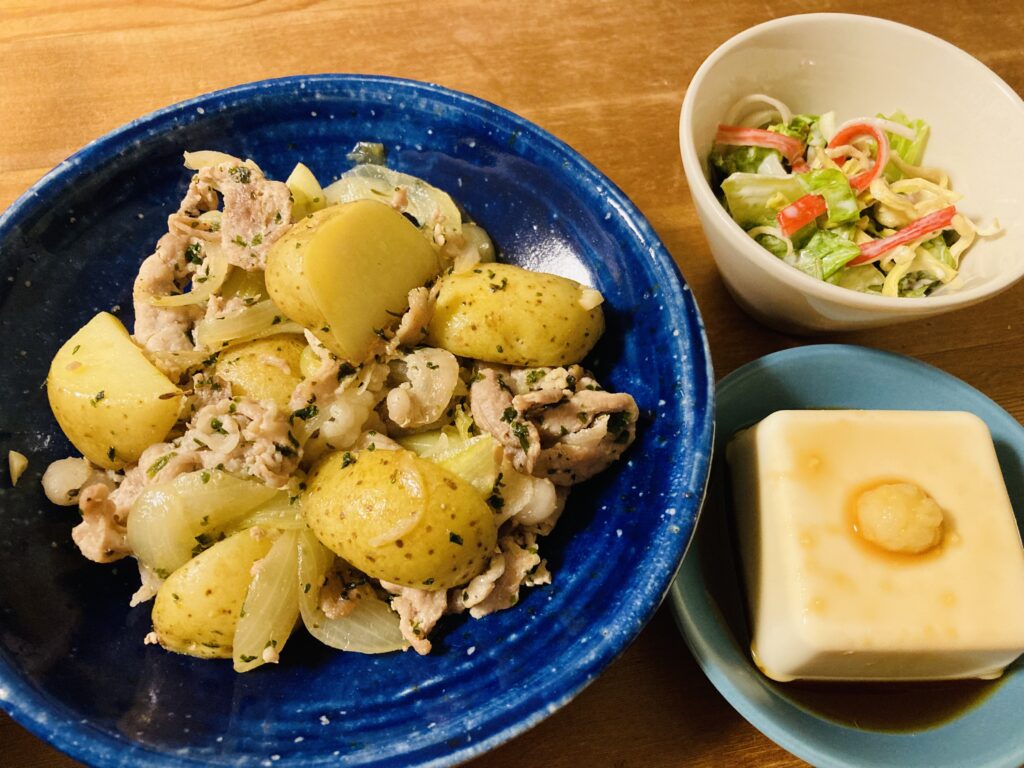 おかずは豚肉のジャーマンポテト、切り干し大根のコールスローサラダ、冷奴です。
