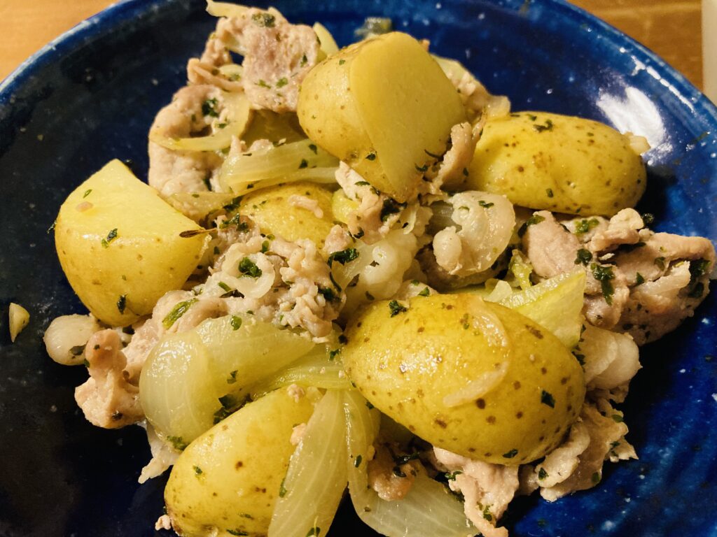新じゃがはレンジで加熱してから豚肉と合わせ炒めました。
