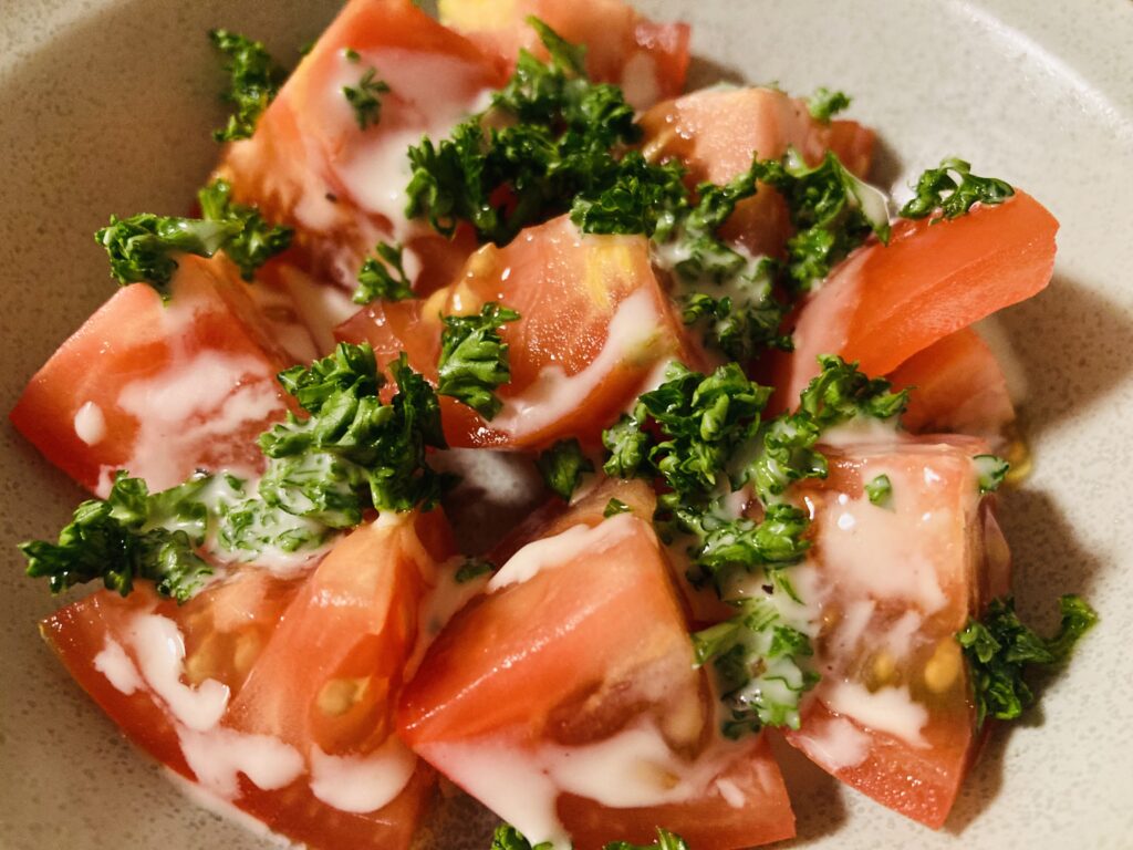 トマトとパセリのサラダは、切ったトマトにみじん切りパセリとシーザードレッシングをかけただけ。