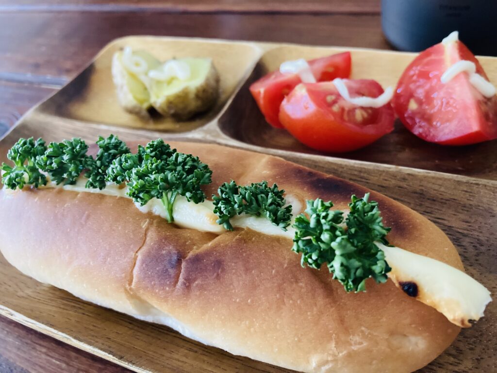 ホットドック用のパンにチーズとマヨネーズをはさんで焼いて、パセリをのせました。