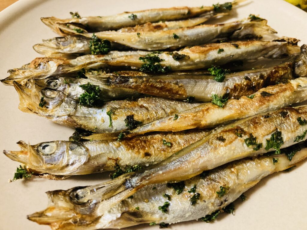ししゃものパセリ焼きは、フライパンにクッキングシートをひいて冷凍ししゃもをのせ、オリーブオイルと塩とパセリをかけて両面弱火で焦げ色がつくまで焼きました。