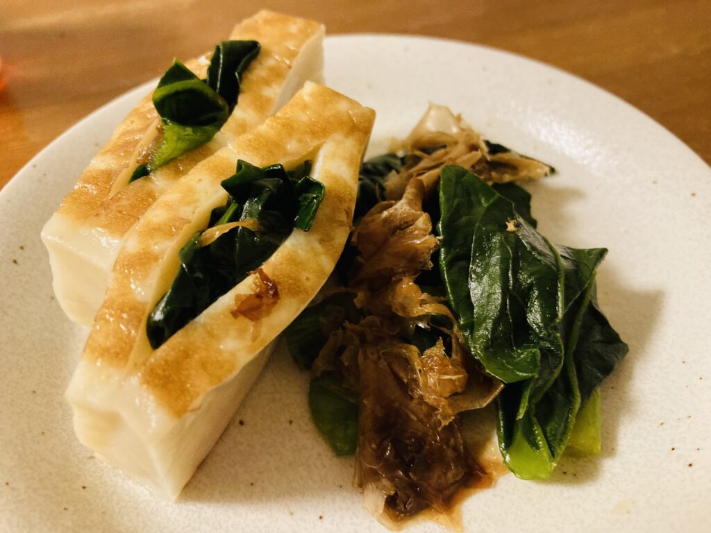 お正月の残り食材のカマボコに、ほうれん草のお浸しをはさんでみました。