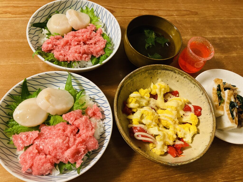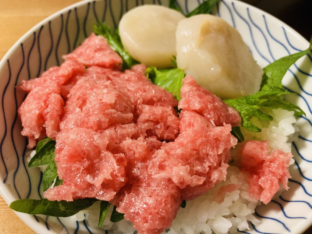 年末に三崎漁港で購入し、冷凍しておいたマグロのたたきとホタテを丼にしました。