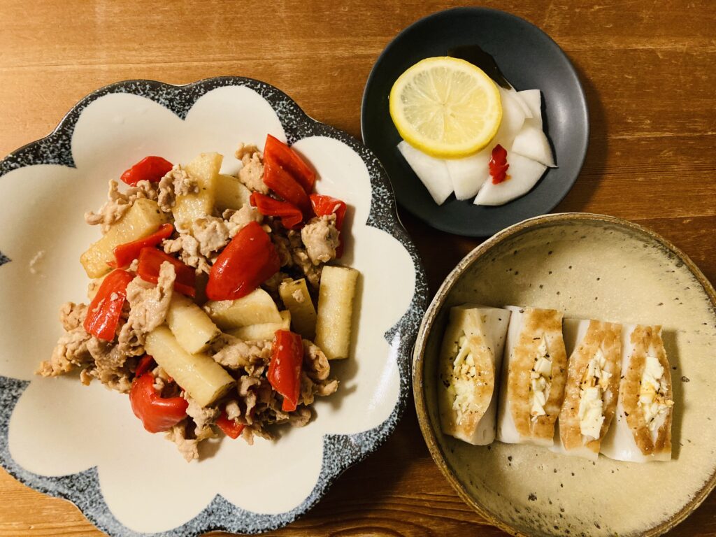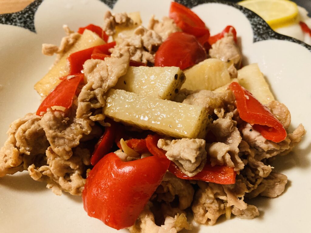 豚肉、赤ピーマン、長芋、ニンニクを炒め、塩とガラスープの素で味を調えたら出来上がりです。