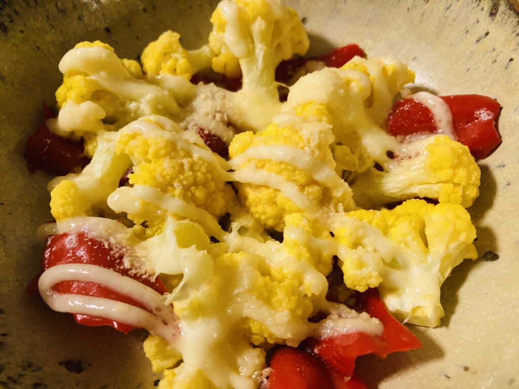 副菜は黄色カリフラワーと赤ピーマンのマヨチーズ焼きです。