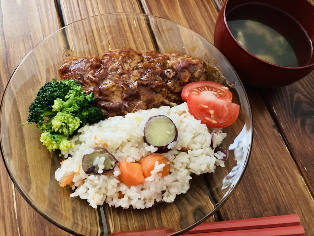 炊き込みご飯にブロッコリーとトマトを添えて、コンソメスープをつけたおうちランチです。