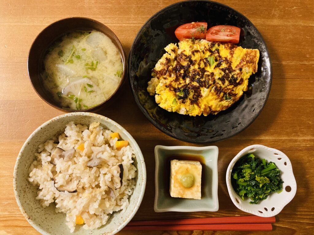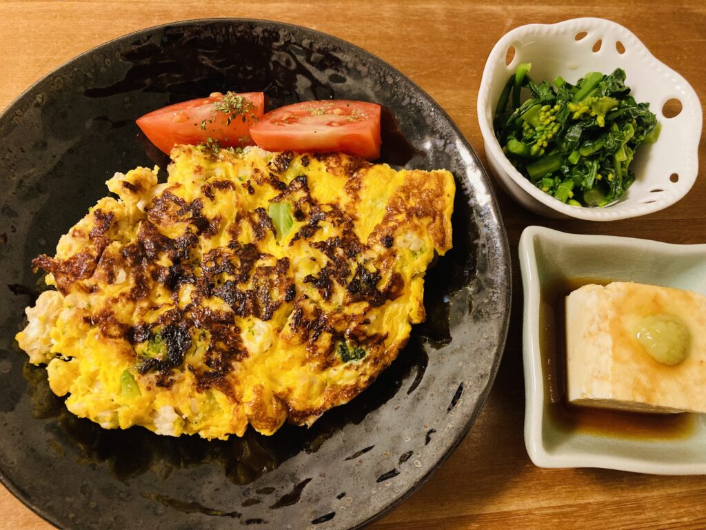 そんな春の日の晩ごはんは、鶏ひき肉のオムレツ、菜の花の柚子胡椒お浸し、冷奴(わさび)、炊き込みご飯、レンコンと豆苗のみそ汁です。