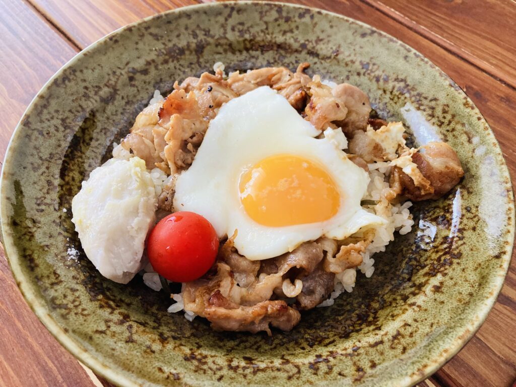 ごはんの上に焼いた豚肉と目玉焼きをのせた、焼肉ワンプレートです。