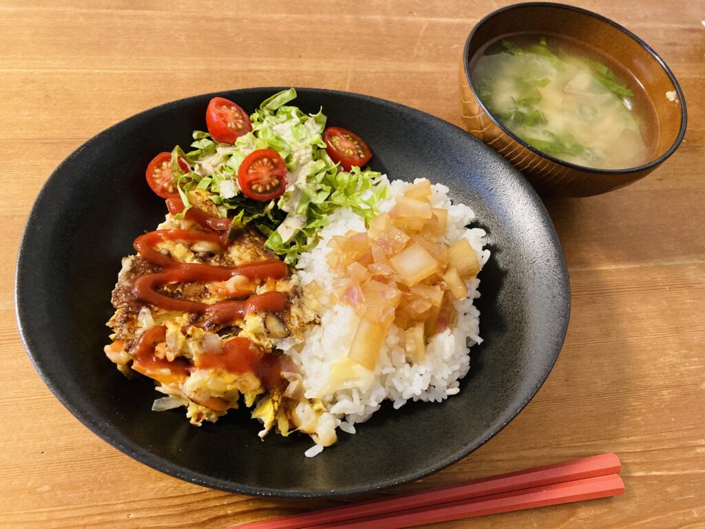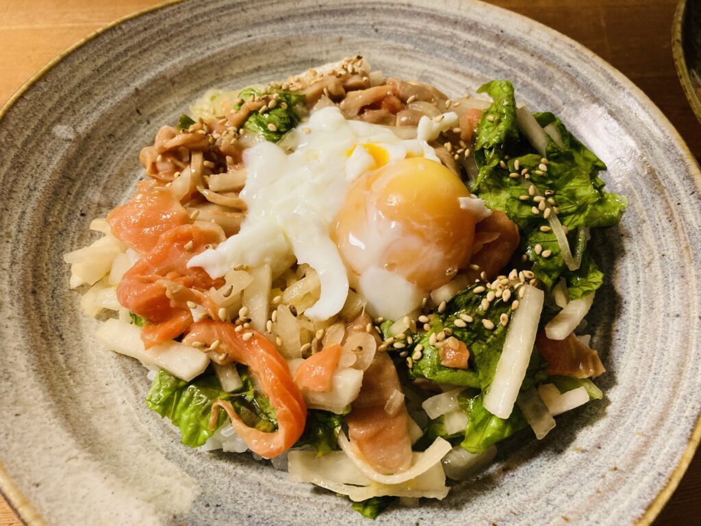 あとはサラダをのせて、ごはんの上に手作り紫玉ねぎドレッシングをかけたら出来上がりです。