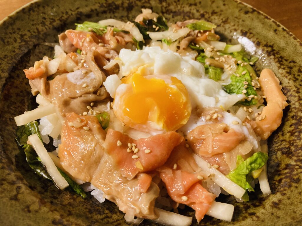 お買い得だったスモークサーモンの切り落としを、野菜と卵と一緒にのせて丼にしました。