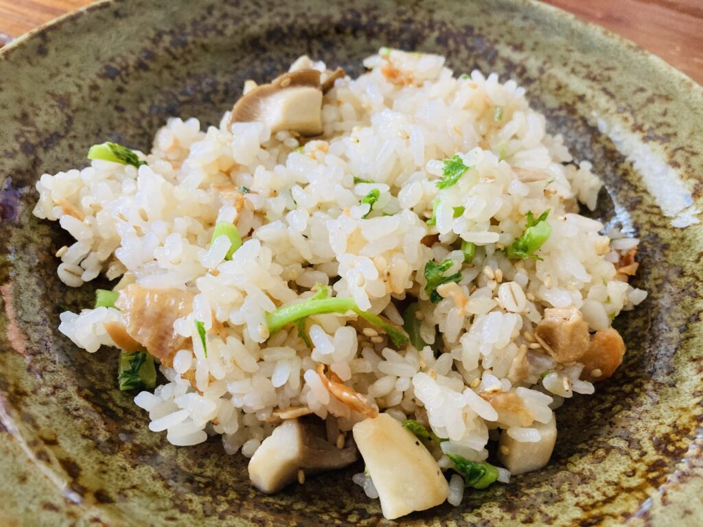 チャーハンの具はスモークサーモン、エリンギ、大根の葉。
