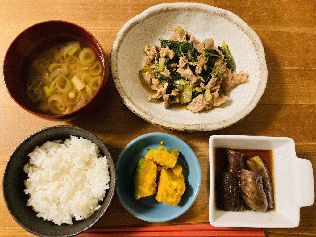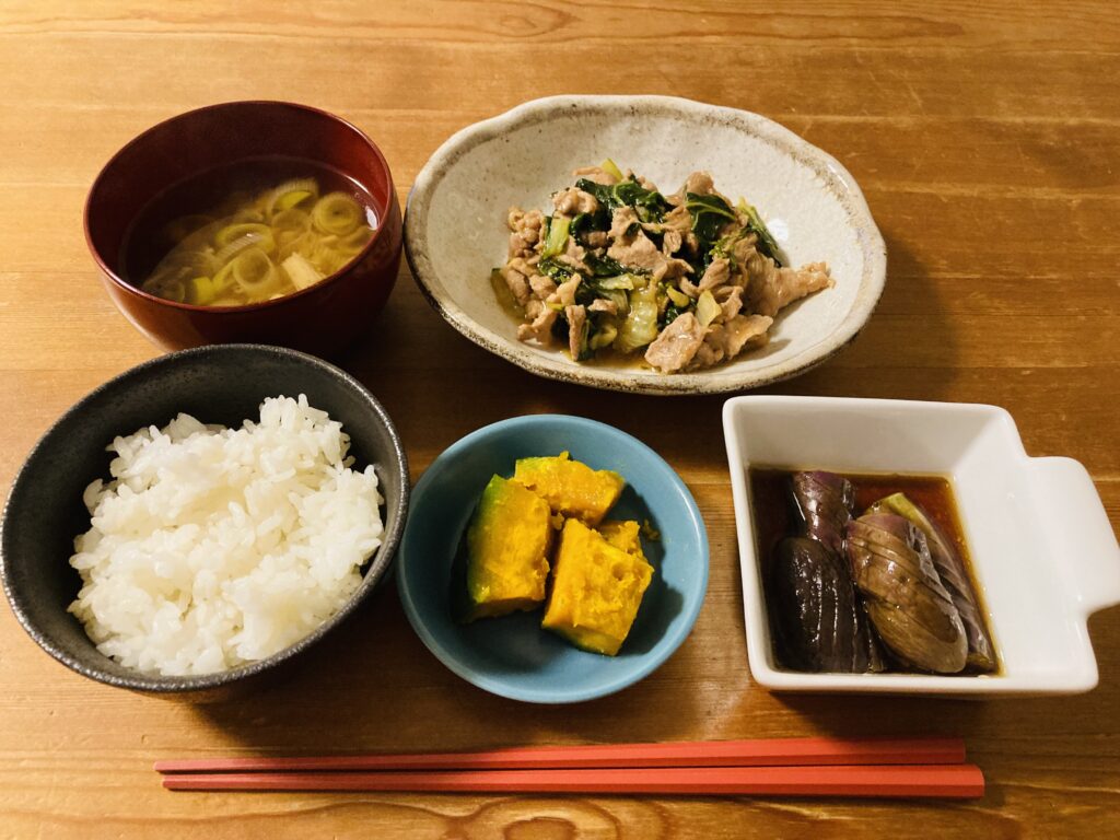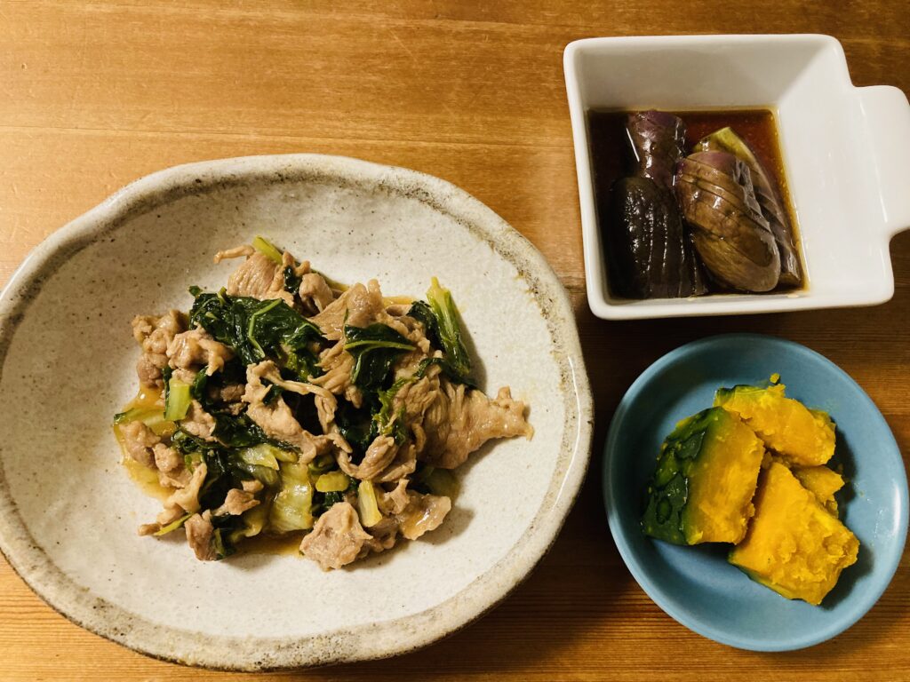 おかずは豚肉と白菜の中華炒め、塩バターカボチャ、ナスの中華風煮びたしです。