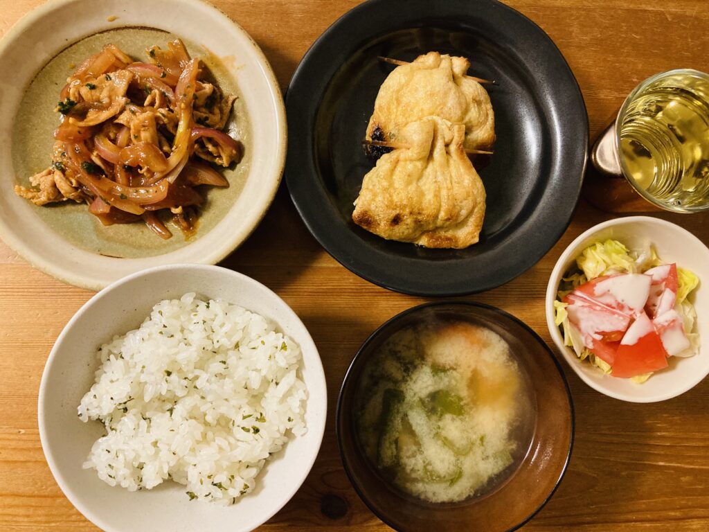 晩ごはんのメニューはポークチャップ、肉入りきんちゃく、サラダ、パセリごはん、みそ汁です。