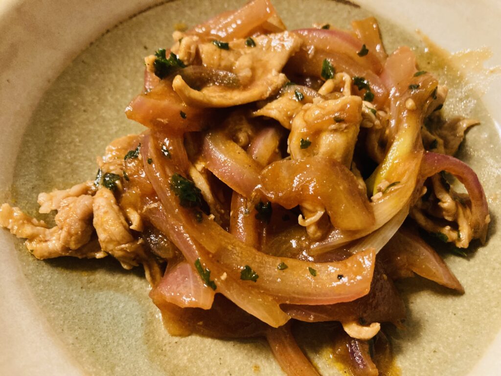 豚コマと紫玉ねぎとパセリで作ったポークチャップです。
