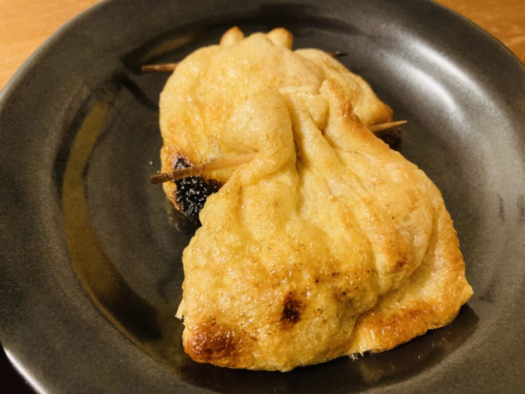 魚焼きグリルにくっつきにくいアルミホイルをひいてきんちゃくをのせて、両面で10分ほど焼きました。