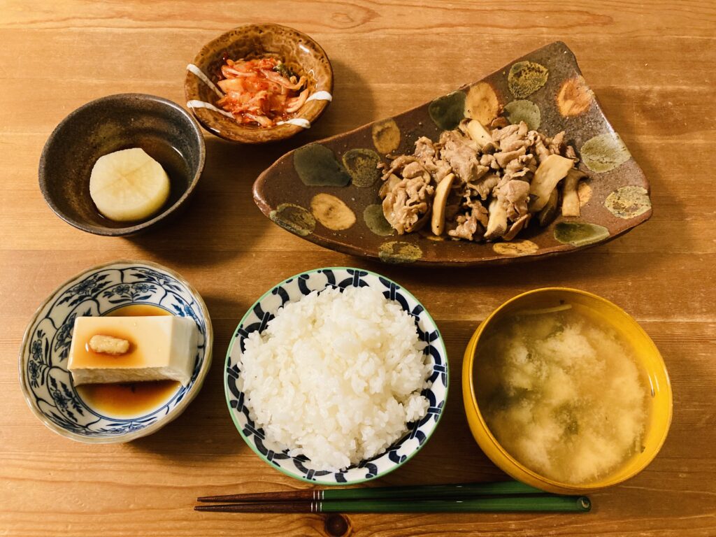 この日の晩ごはんのメニューは、豚肉ときのこのバター醤油炒め、キムチ、冷奴、ふろふき大根、ごはん、カリフラワーと三つ葉のみそ汁です。