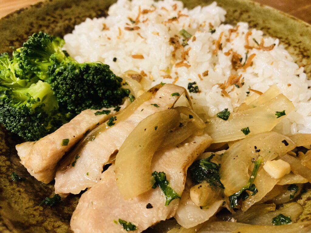 豚トロを柔らかく焼くポイントは、玉ねぎの上にお肉をのせて焼いたこと、加熱時間、火加減だと思います。