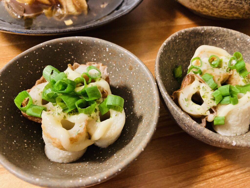 切ったちくわにマヨ、わけぎ、乾燥パセリをのせてレンチンしただけの簡単おかずです。