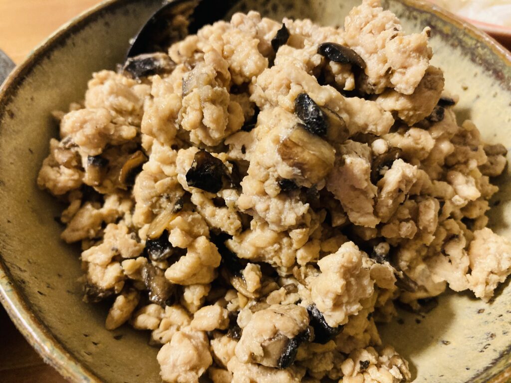鶏ひき肉にブラウンマッシュルームを加えて炒め、醤油とみりんと酒とハチミツで煮詰めました。
