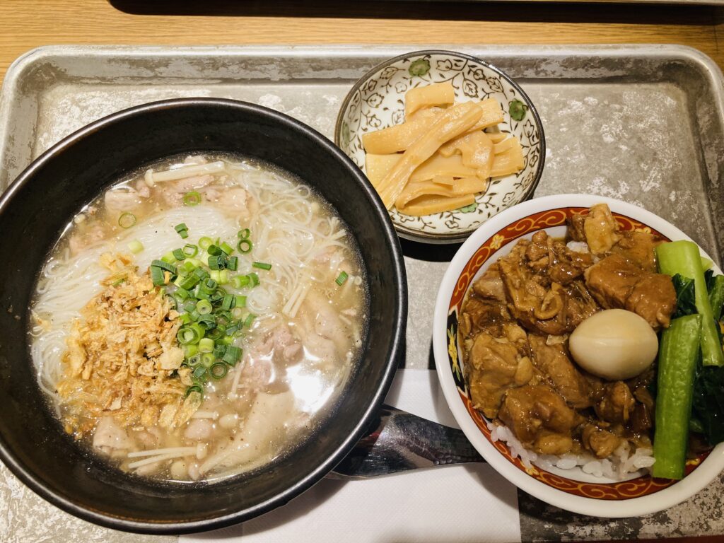 モツや挽き肉が入った薬膳のようなスープにフォーのような米粉麺(素麺のような細さ)が入った麺料理と、ルーロー飯のセットに決定。