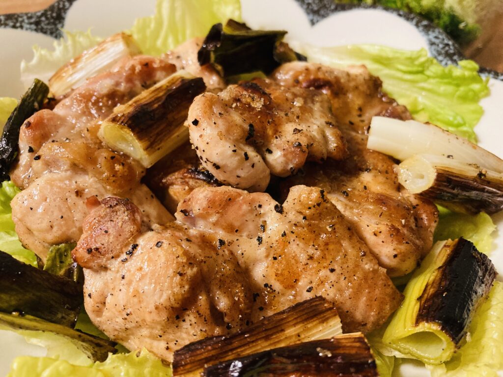 焼き鳥は塩コショウをたっぷりつけた鶏もも肉を、長ネギと一緒にアルミホイルにのせて魚焼きグリルで両面じっくり焼きました。