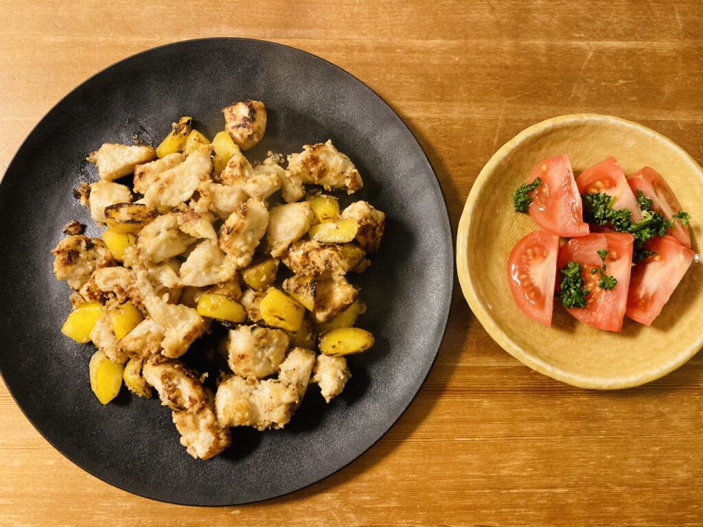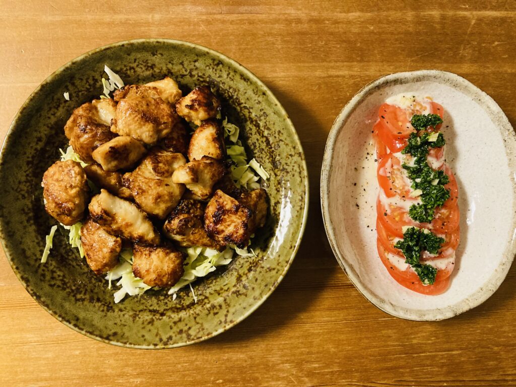 ビニール袋に切った鶏胸肉と調味料(生姜たっぷり、ニンニク、醤油、みりん)を入れて漬け込み、軽く片栗粉をまぶしてサラダ油で焼いたら出来上がりです。