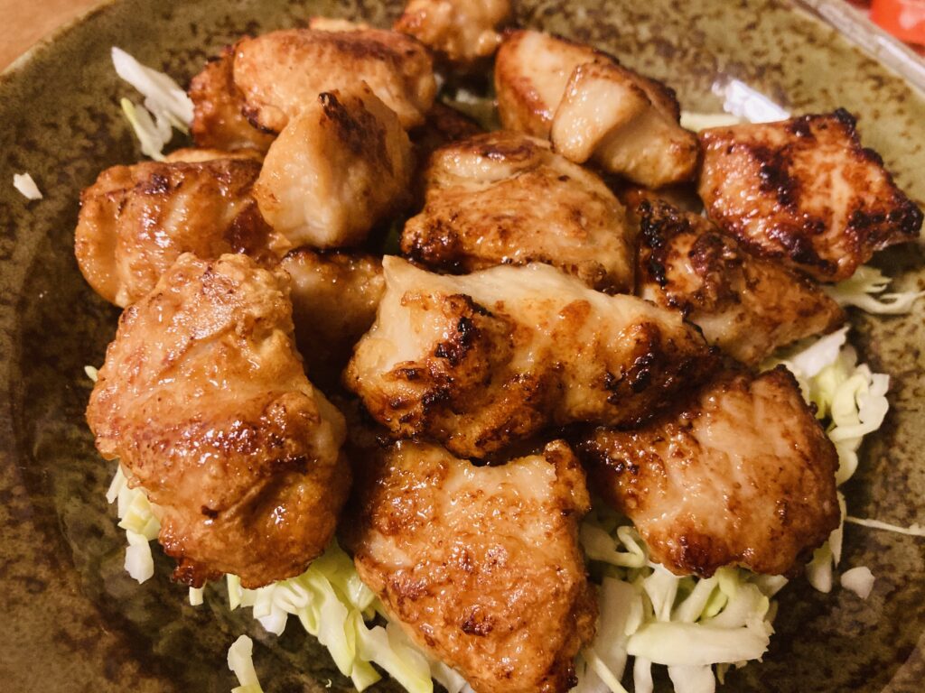 晩ごはんのメインのおかずは、鶏もも肉で作った串なしのジャンボ焼き鳥です。